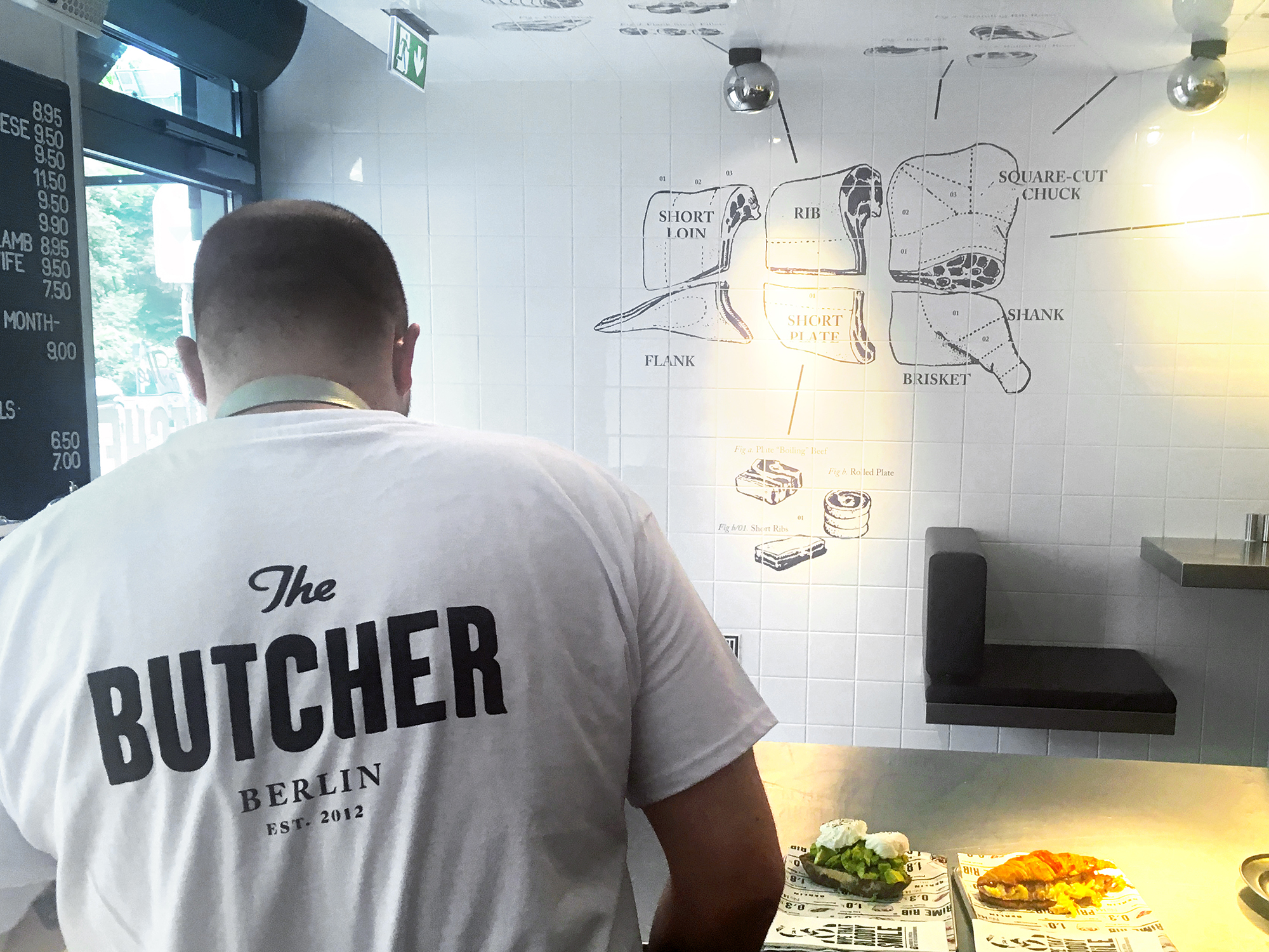Fleisch ist das Thema im The Butcher – auch beim Burger (Prime Aberdeen Angus) ist das Fleisch auf den Punkt gegrillt – und mit einem fantastisch, intensiven Geschmack serviert wird. Mit wechselnden Lunchmenüs, wechselnden Burgern und dem herrlichen Grillduft werden die Gäste von der Kantstraße ins Lokal gelockt und verweilen dann meist ein paar Stunden unter den weißen Fliesen, Bildern von Steakcuts und an den Edelstahl-Tischen. Eine lange Bar und eine große Speisenkarte am Eingangsbereich im 1950er Stil zaubern einen ganz besonderen Stil, der sich zwischen rustikal und stylisch bewegt – und auf jeden Fall appetitanregend wirkt.